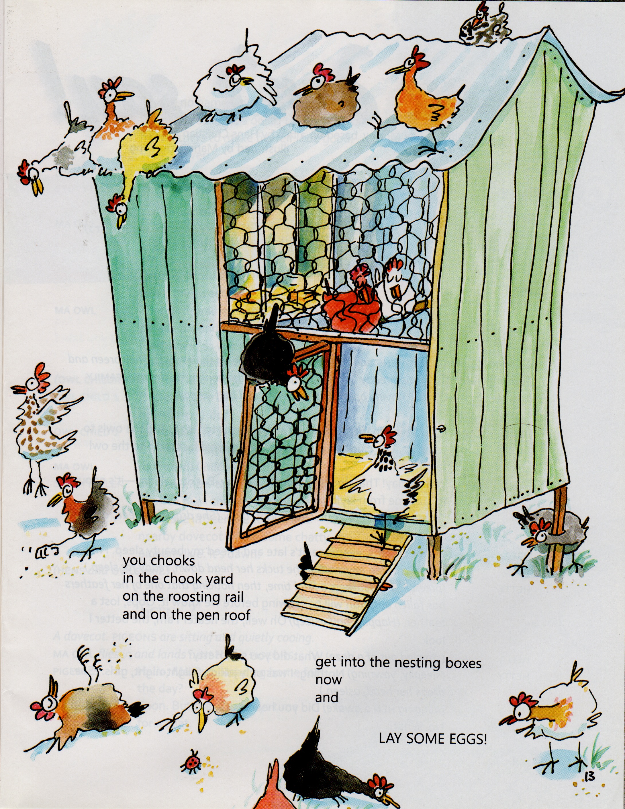 When I’m out at schools, I have enormous enjoyment performing this poem with children. They LOVE being chooks, and they also love shouting the last line, commanding the chooks to LAY SOME EGGS!