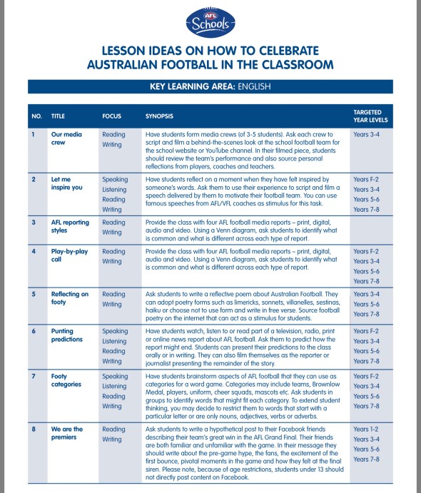 Find below a link to the AFL Teaching and Learning Resources and a screen shot with suggestions for English. Also a link and screen shot to a NRL site re a Well Being unit for schools.