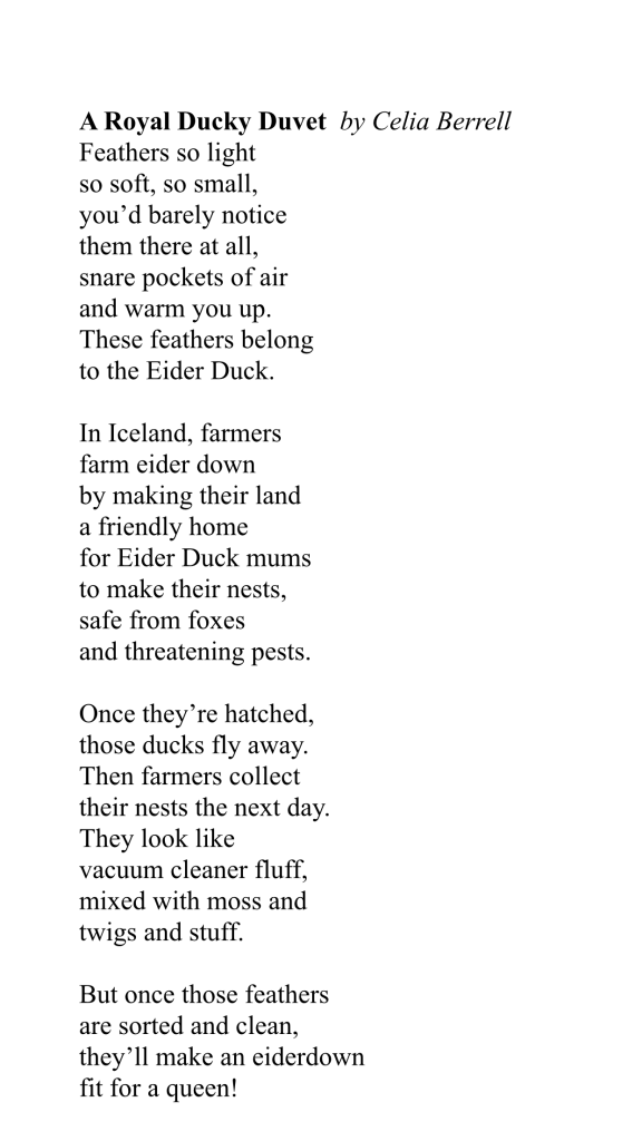 I learned a lot from this Cecilia – I’ve never thought about eider as a particular species of ducks – and what a lovely story about the cooperation between the ducks and the farmers! Obviously works brilliantly, a bit like Permaculture. Virginia.