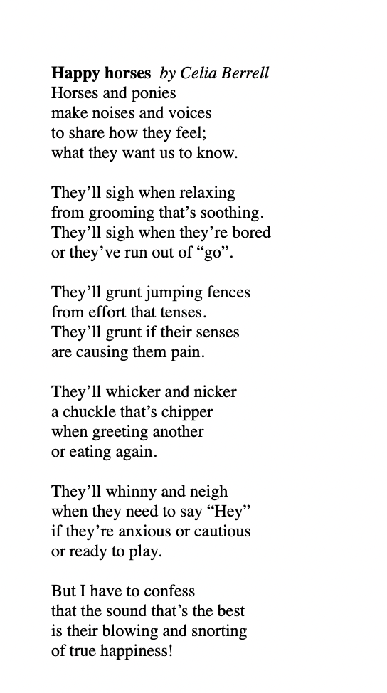 “Happy horses” by Celia Berrell Leave a comment By australianchildrenspoetry June 29, 2021 https://www.newscientist.com/article/2174005-we-now-know-why-horses-snort-because-theyre-happy/ Share this: Click to share on X (Opens in new window) X Click to share on Facebook (Opens in new window) Facebook Click to email a link to a friend (Opens in new window) Email Click to print (Opens in new window) Print Click to share on LinkedIn (Opens in new window) LinkedIn Click to share on Reddit (Opens in new window) Reddit Click to share on Pinterest (Opens in new window) Pinterest Click to share on Pocket (Opens in new window) Pocket Like Loading... Related