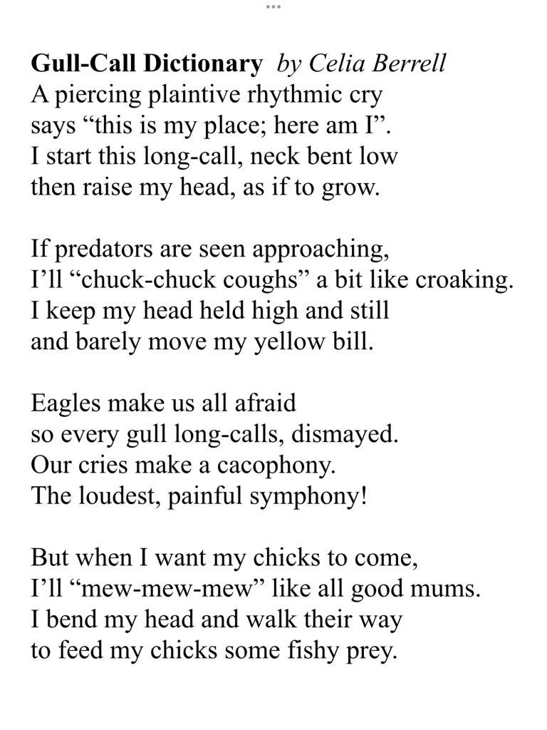 “Gull-Call Dictionary” by Celia Berrell Leave a comment By australianchildrenspoetry March 21, 2023 You can hear these gull calls at: https://www.seattletimes.com/pacific-nw-magazine/listen-gull-calls/ Share this: Click to share on X (Opens in new window) X Click to share on Facebook (Opens in new window) Facebook Click to email a link to a friend (Opens in new window) Email Click to print (Opens in new window) Print Click to share on LinkedIn (Opens in new window) LinkedIn Click to share on Reddit (Opens in new window) Reddit Click to share on Pinterest (Opens in new window) Pinterest Click to share on Pocket (Opens in new window) Pocket Like Loading... Related